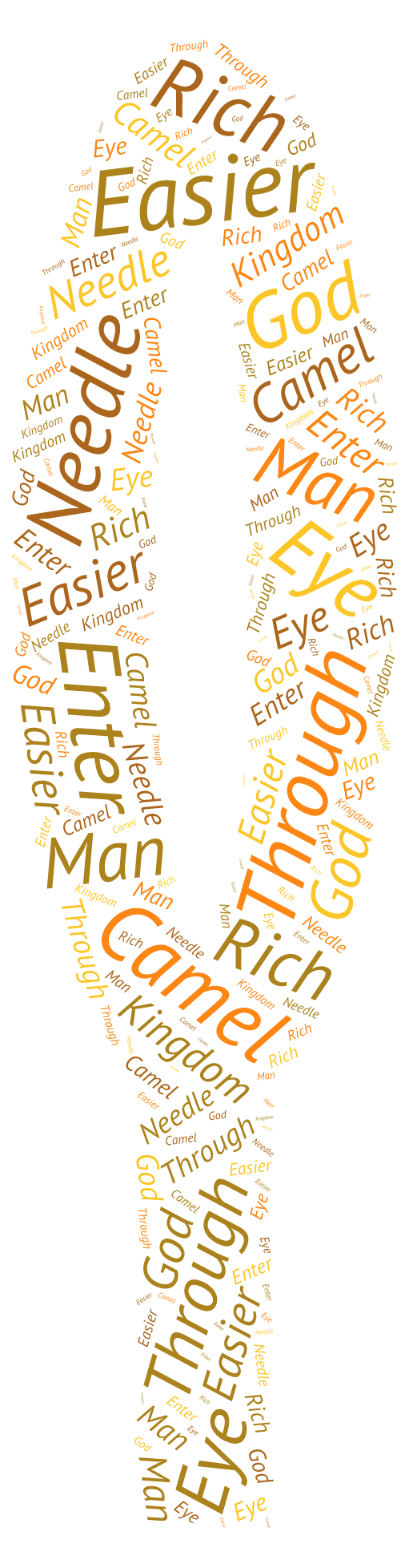 It’s not that having wealth itself is a bad thing. In Jesus’ time it was a sure sign of God’s blessing. That’s why the disciples were surprised. “If even someone as obviously blessed by God as this rich man can’t enter God’s kingdom, what hope is there for the rest of us?” Jesus’ answer? None at all. We’d say it’s as hard as nailing jelly to the wall, or finding a needle in a haystack. Jesus talked about camels.
