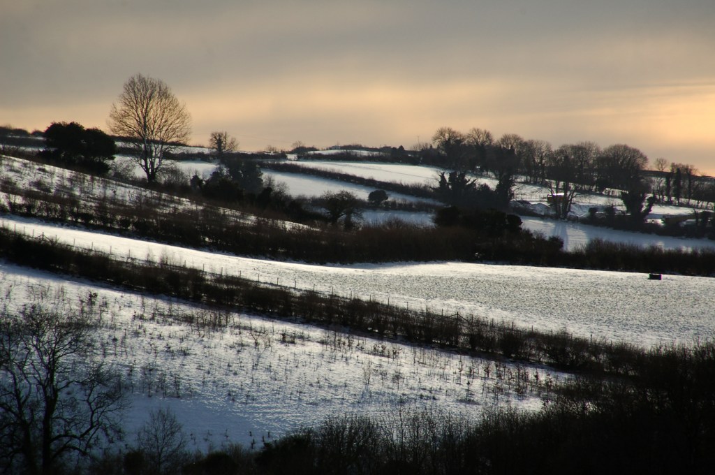 My photo is a parable of changeability. The day before, Dartmoor was bathed in clear winter sunshine, and wearing a warm jacket was only a nod to common sense. Overnight the wind veered north-east and the polar air mass wobbled its way to the hills and moorland of glorious Devon. My word, it was parky! Snow covered the fields and the hedges stood stood out in stark relief under a lowering sky that threatened more to come. Moody landscapes are much sought after by photographers. Changing light transforms the countryside, and on this day there was just the perfect amount of low-angled sunlight to draw long shadows over the snow.