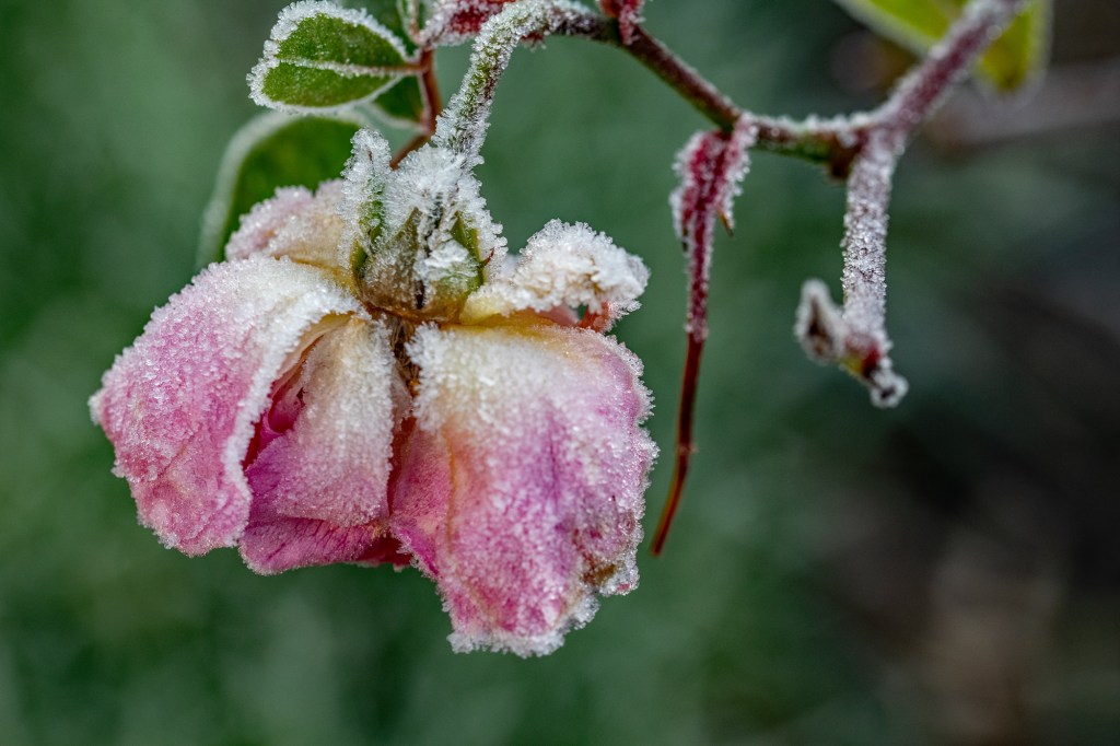 I had taken note that the frost had turned the garden into an art gallery. Frost edged leaves, even a lonely ice-glazed rose, and diamond-decorated berries. Beautiful in a wistful way.