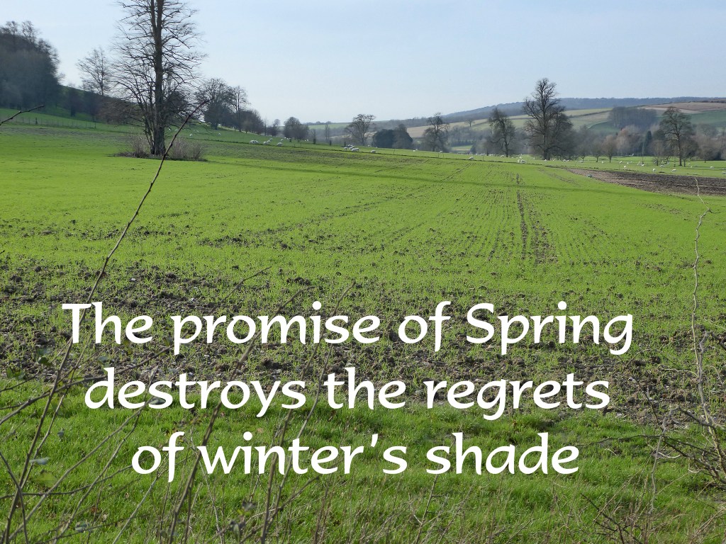 What else lifted my spirits? Going through some photographs taken in January of a previous year. One of those rare January days where a pale blue sky stands as backdrop to leafless trees, and the cool sunlight encourages the first shoots of wheat to break surface, tiny ribbons of emerald glistening against the rich dark loam. As I looked at the picture, it brought back memories- and prompted wandering thoughts. “What about those sheep? They should be lambing soon…”