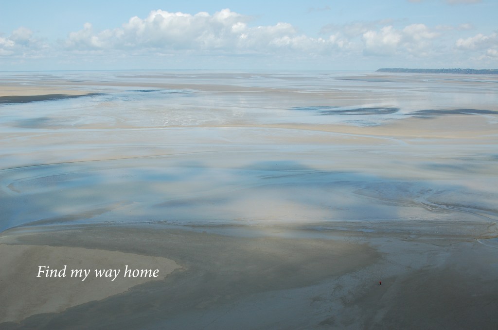 If you look VERY closely there is one human figure in this photo. Taken from the high walls of Mont St Michel, the sands stretch across the bay with shallow pools, shifting channels, and quick-sands awaiting the unwary. It is possible, said the guide, to cross the bay at low tide and reach the town on the mainland. But time is limited since the tide sweeps in rapidly, and without a guide you may well become lost and risk drowning. The light and water play tricks on the senses. Distances and direction become easily confused.
