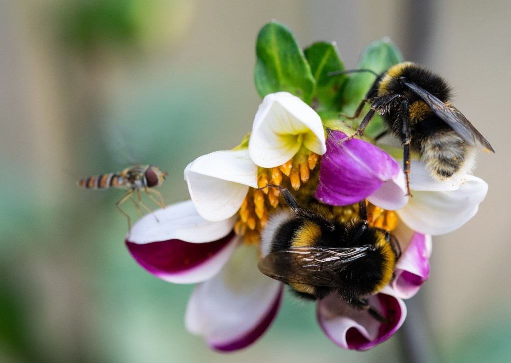 These bees were queueing for fuel: seeking the nectar (and in the process pollinating the dahlias). They were joined by a hover fly who photo-bombed the shot! They all bee-haved nicely, waiting in patience for their turn “at the pump.”