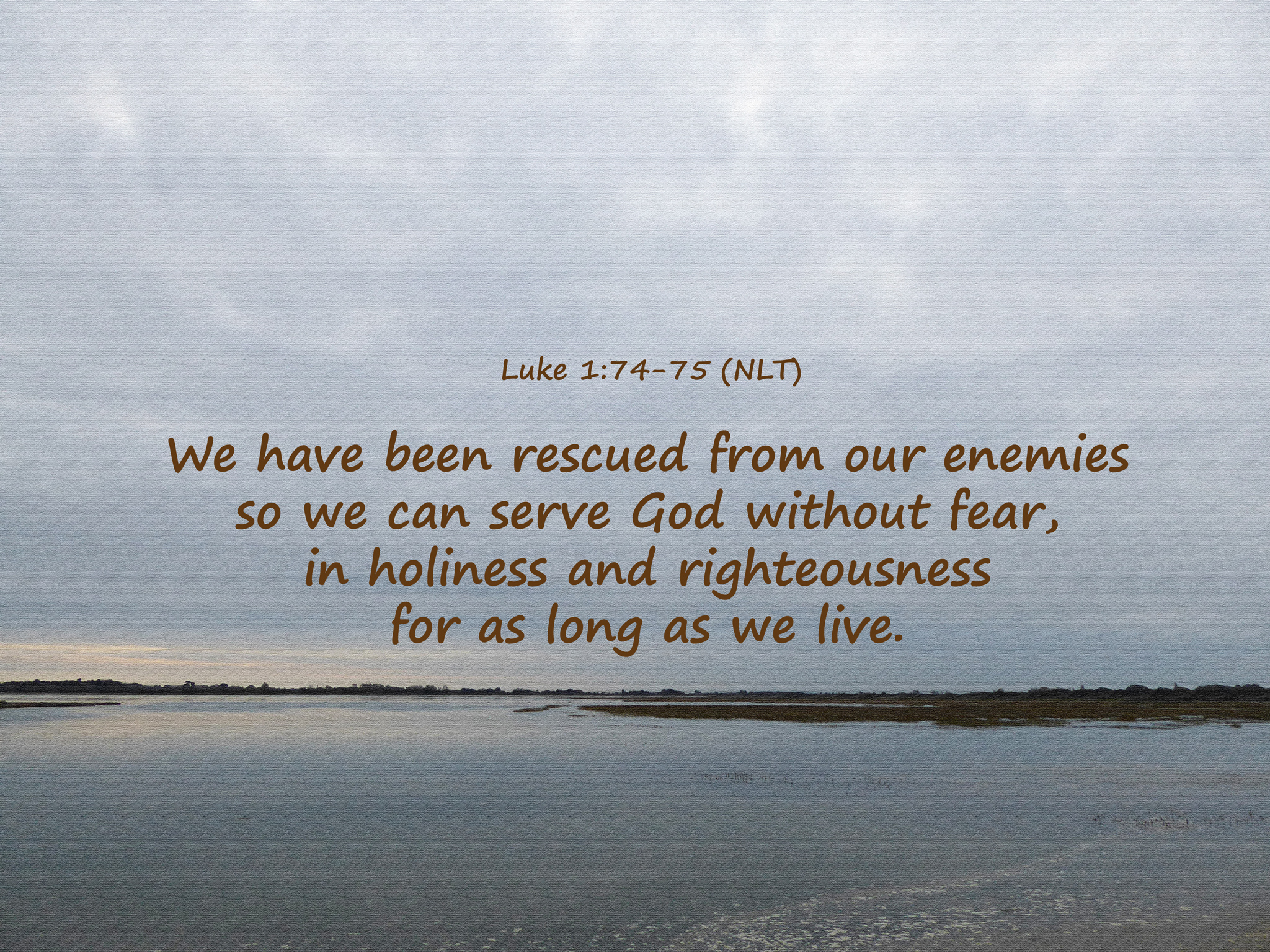 Luke 1:74-75 (NLT) “We have been rescued from our enemies so we can serve God without fear, in holiness and righteousness for as long as we live.”
