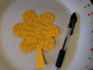 - Write a verse from Psalm 1 – mine is paraphrased – and decorate with leaves