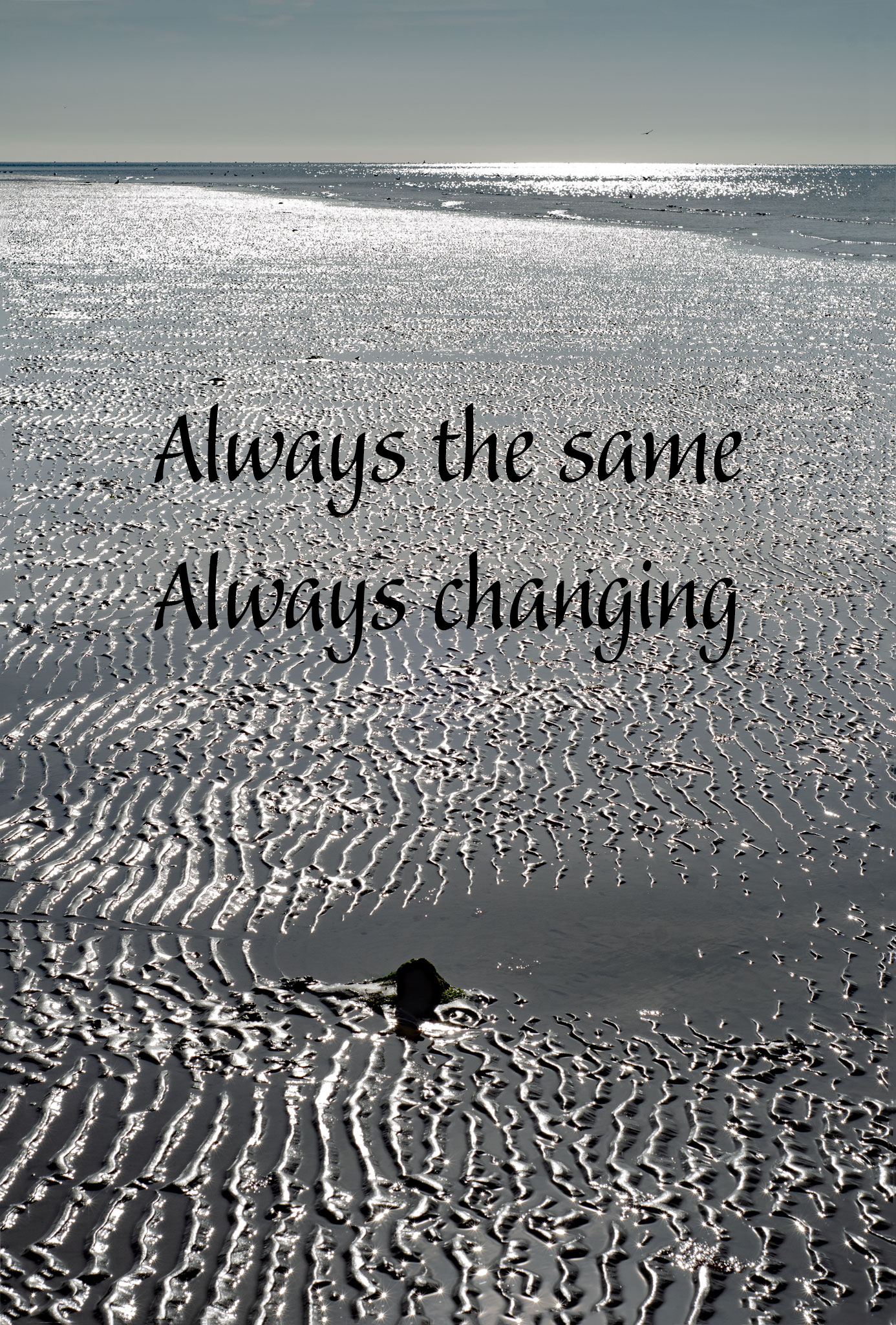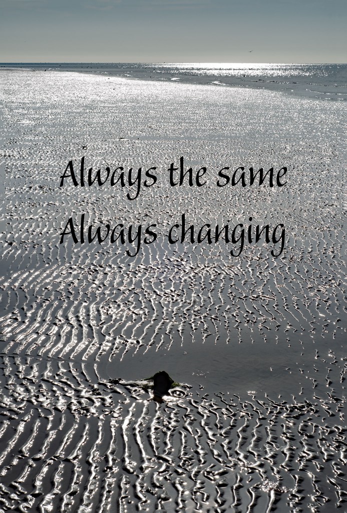 On some mornings it is a place of wonder as the light turns sand to silver. A few fortunate people like me have time to walk, to wait, to watch. It is never a boring place to be- the slow dance of land and sea is enthralling. Every morning a new photograph can be born- the same scene, yet uniquely fingerprinted by the powers of Nature – and so always changing.