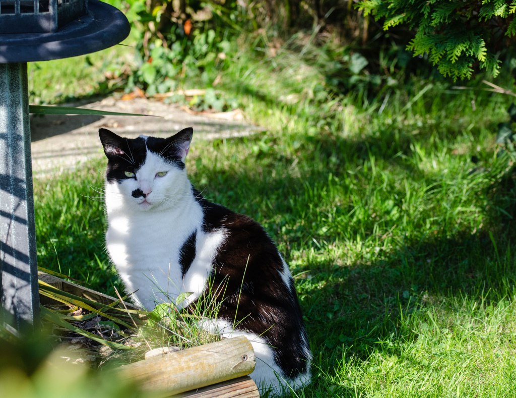 Just why does a cat linger near a birdtable? Hmmm. Trying to look innocent, and viewing me with disdain. He’s not ours; but he deigns to allow a limited fuss, especially ears and chin. Only when he’s in the mood. I do like cats, but he’s not very cuddly.