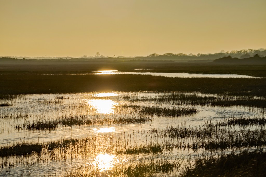 This day deserved a perfect ending. Golden sun reflecting from the waters of a nature reserve where a day subsides into restful peace, marked by whistling curlews and distant geese honking as they settled for the night. This is bliss.