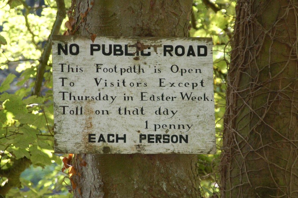 If a landowner permits use of a path without restriction, it becomes a Public Right of Way. There is a way to prevent the legal change: if the path is closed on at least one day per year, or the owner charges a Toll for passage, the landowner retains title and the path remains private property. I came across a fine example of the “small print” which a generous-spirited landowner used as legal protection, but allowed virtually unlimited access to the visitor.