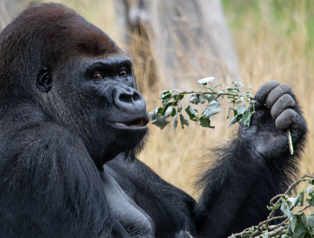Gentleness is about controlling strength; nurturing and protecting is a valid use of their power. Scientists have remarked on the tenderness of gorilla parenting, and the ways in which they show affection to their group members. We must not infer human attitudes as motivation- gorillas are dangerous if cornered or angered- but living in their “ideal” home they are surprisingly non-violent. Food, sleep, and family are their priorities. Not a bad way to live!