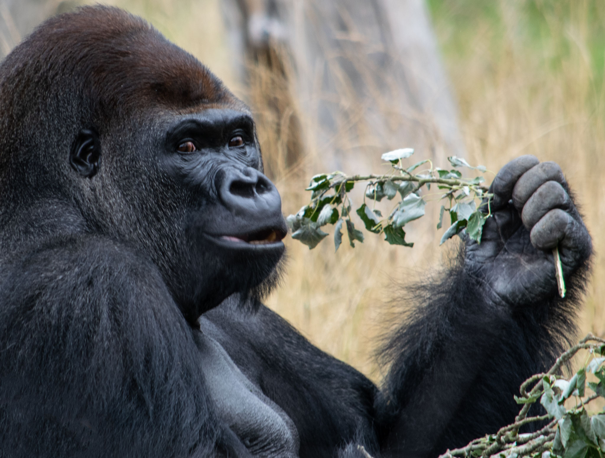 This gorilla is part of breeding pair in a conservation programme. I visited just after fresh feed had been supplied, and he sat quietly and gnawed in contentment. Mum and infant (surprisingly cute!) were inside as Pop’s picnic was consumed.