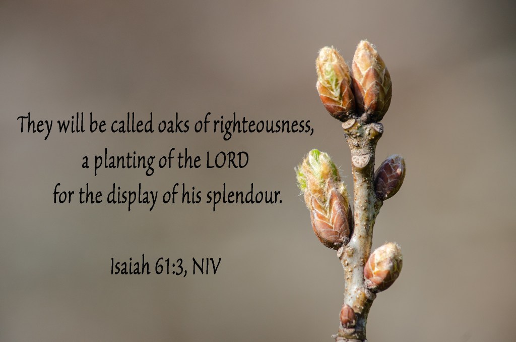 Oak trees are majestic, strong, and beautiful; they can thrive for hundreds of years. When Isaiah spoke God’s message, the oak is a symbol of the transformation through God’s power. Ordinary people, weak people, and hurting people are changed and become more and more like Jesus.