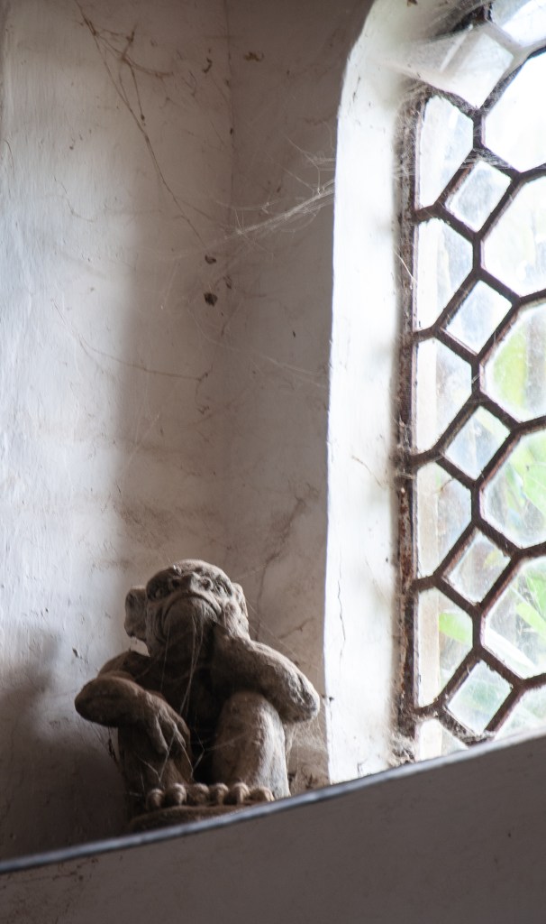 A fed-up gargoyle- abandoned and swathed in cobwebs. The building is being preserved, but as a showroom of the past instead of its original holy purpose. The expression caught by the sculptor in the stony face, and the resigned air of the arms all serve to brin g out the despair of neglect.