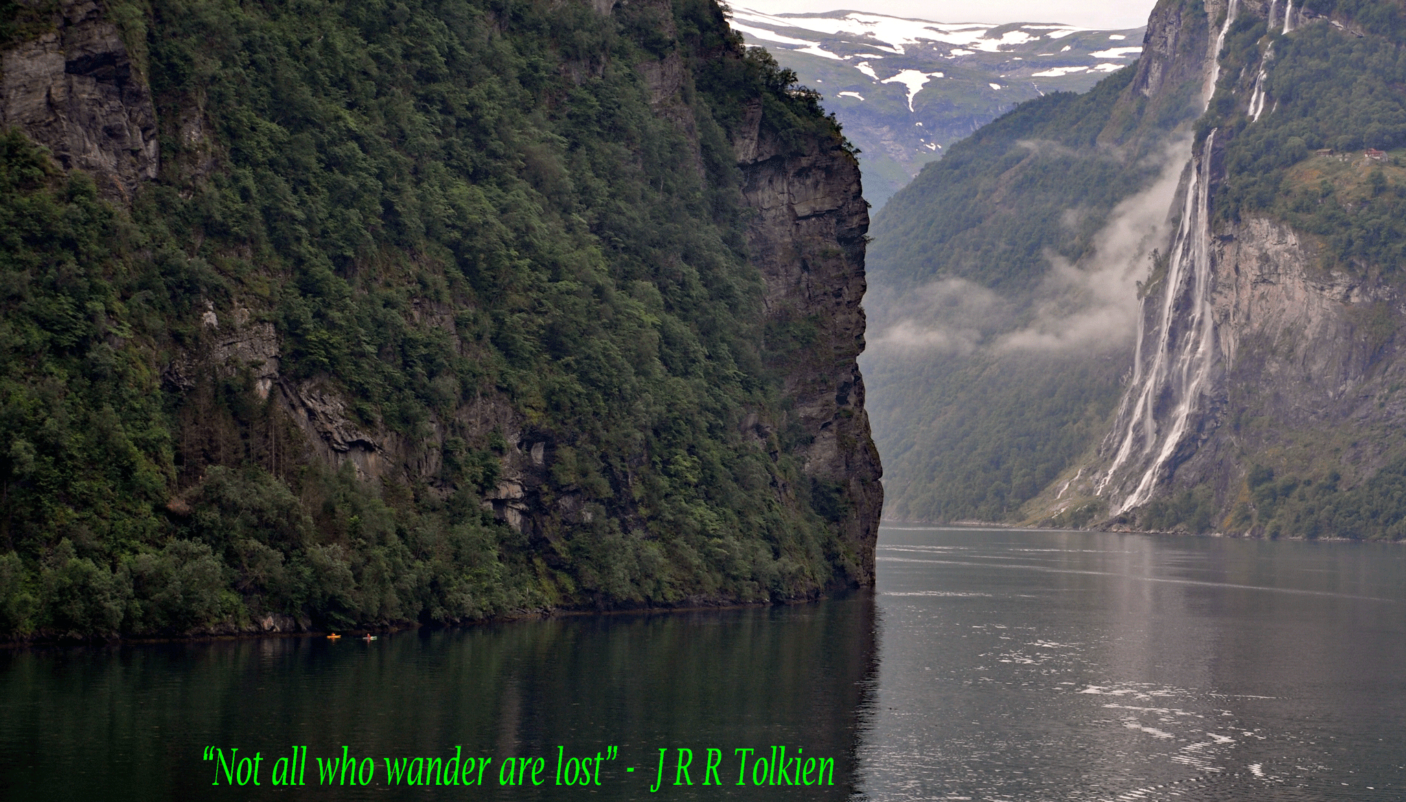 Have another look at the photo. Look harder! Do you see the two tiny canoeists? At the base of the wooded cliff, just above the quotation. They give a sense of scale to the cliff and waterfall. “Are they mad?” might be your reaction. Tiny little boats in a vast landscape (the fjord is really deep).