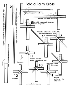 I’ve used a simpler way of making crosses than the type you buy (with a square in the middle), and you can print off a useful ‘how-to’ guide for folding this simpler type of palm cross by clicking on the picture below. (Took me AGES to draw that. You’re welcome.)