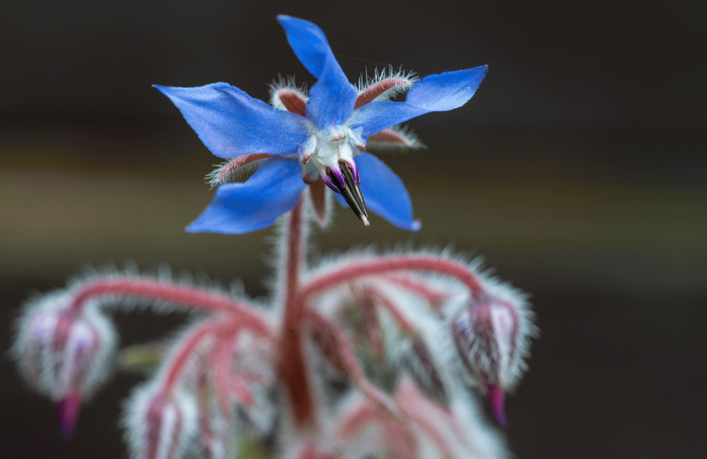 A tiny flower, the first of the hairy cluster to shine forth in brilliant blue with the purple centrepiece, this borage was photographed at 1/40th sec, at f8. A tiny fraction of a second, a small aperture in the lens, and a small masterpiece is unveiled to the Universe.