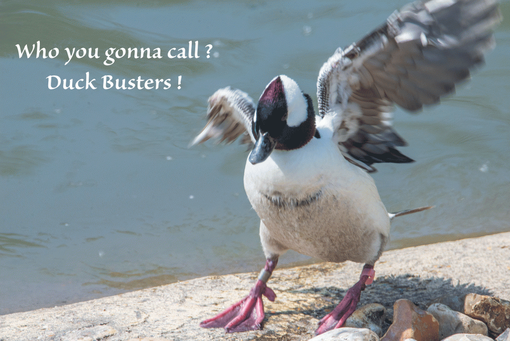 To me, the duck is striking a pose like Batman about to launch… or the Ghost Busters facing another grim ghoul with ramshackle “inventions.” Duck-Busters! Will this catch on?