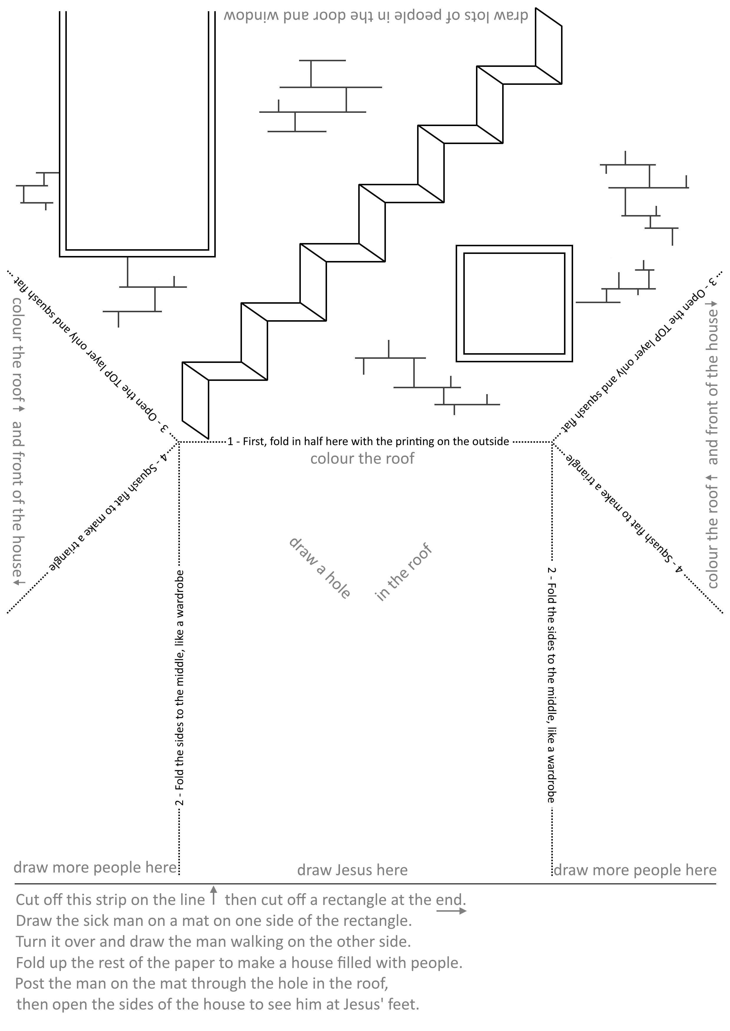 Print off the sheet (A4, sorry my American buddies) and follow the instructions to fold it into a house. Colour in the roof and walls, and fill the windows and doors with crowds of people.