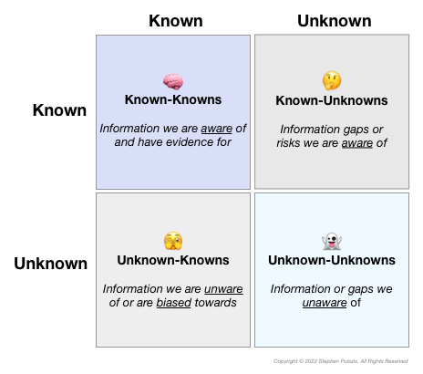 Made famous (possibly infamous) by Donald Rumsfeld during a press briefing about the Iraq War in 2002, the Known/Unknown matrix usefully divided information into four categories