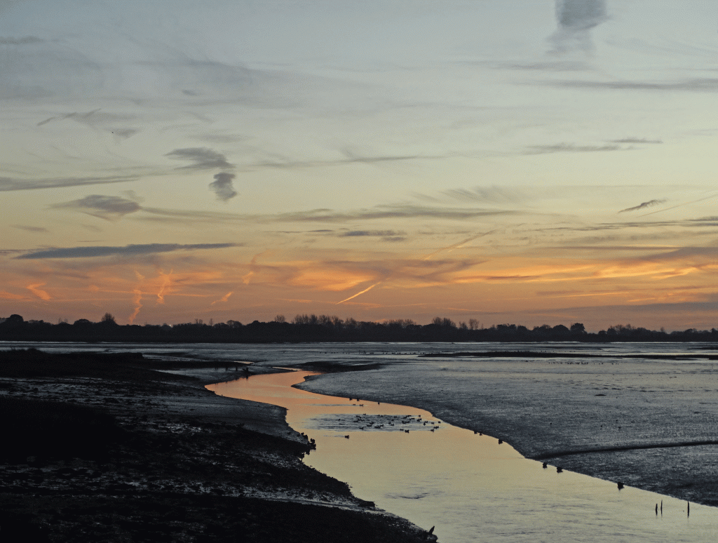 Evening over Pagham Harbour. Low tide. Sunset. You’d almost think it was untouched by humans- except for the giveaway marks in the sky.