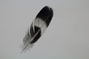 Further along, I found a shorter feather: black, with a white band across the middle. Magpie.