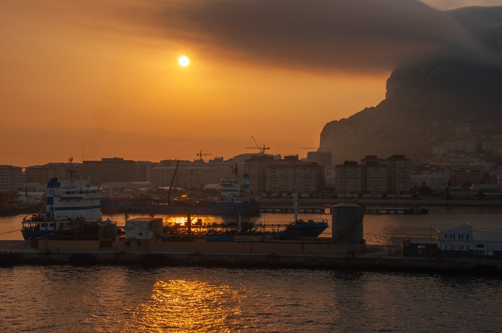Gibraltar at sunrise: the normally busy port lies at rest despite the ominous clouds shrouding the Rock. Dust from North Africa is blown across the Straits, swirling in amazing formations.