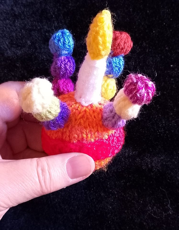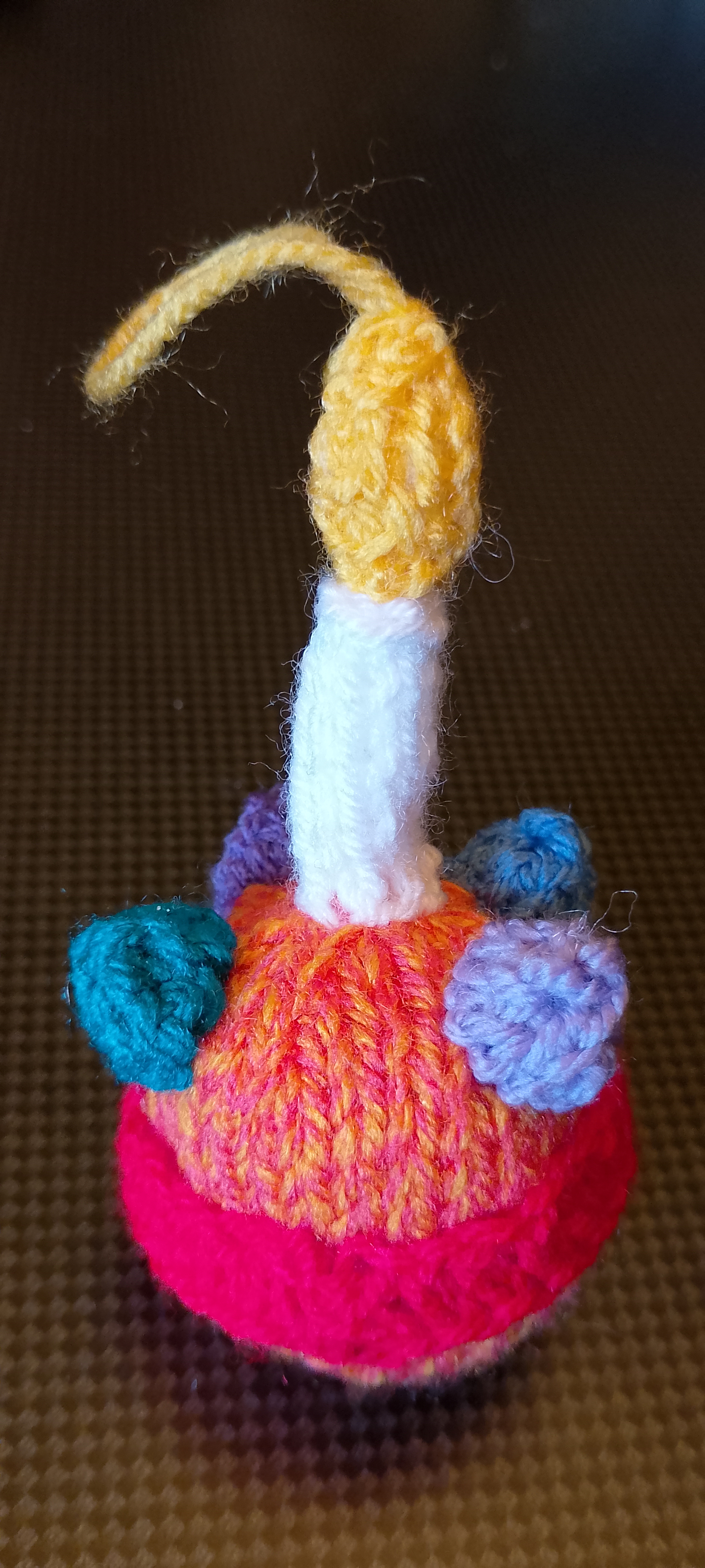 There are two versions, one with sweets-on-a-stick, and one with smaller sweets, making the candle more prominent. Both versions are quick and easy to make, and take no special skill other than being able to knit. Each takes 2-3 hours to complete.