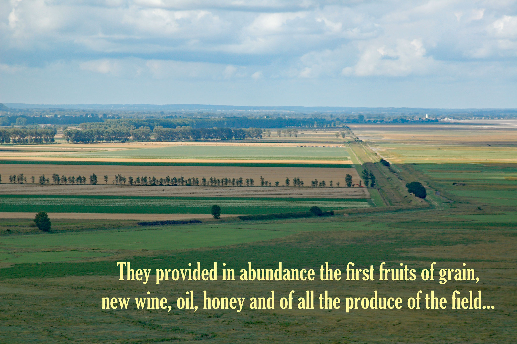 He commanded the people who lived in Jerusalem to give the portion due to the priests and the Levites, that they might devote themselves to the law of the Lord. As soon as the order spread, the sons of Israel provided in abundance the first fruits of grain, new wine, oil, honey and of all the produce of the field; and they brought in abundantly the tithe of all. The sons of Israel and Judah who lived in the cities of Judah also brought in the tithe of oxen and sheep, and the tithe of sacred gifts which were consecrated to the Lord their God, and placed them in heaps.