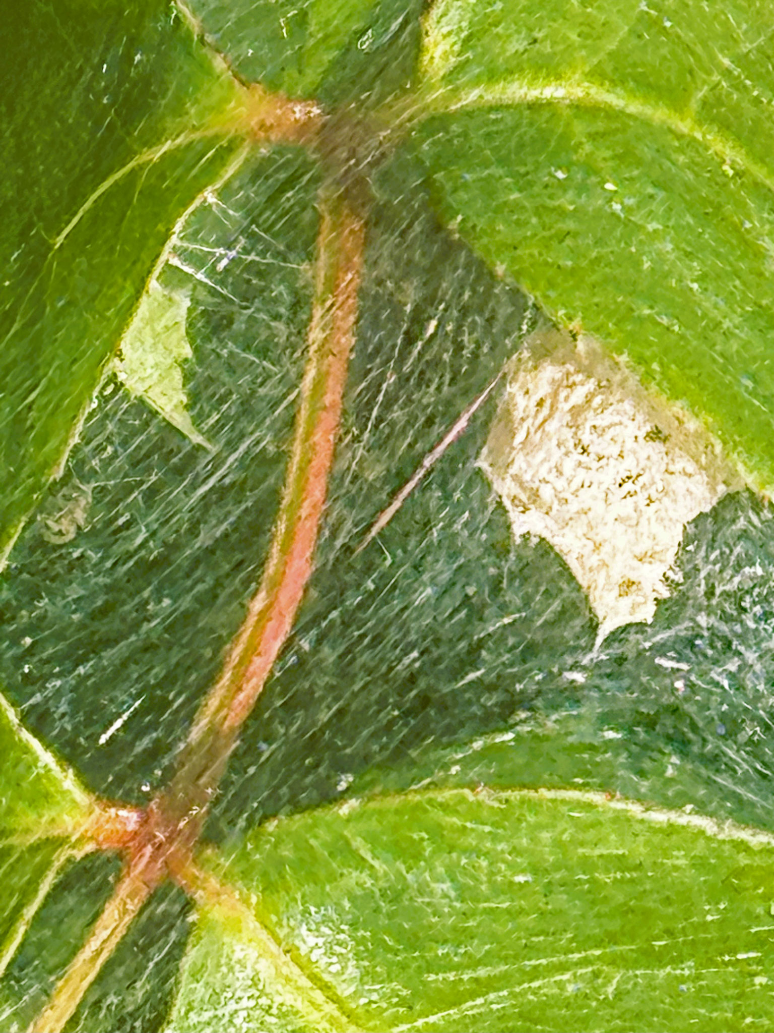 Marvellous construction: the spider has wrapped three rose leaves with layers of web-silk, thus protecting the interior space where she laid her eggs. That’s the creamy-white blob centre right. Concealed within that silken shell are hundreds of spiderlings, and when you watch closely they run around reacting to the risk level. Quite fascinating!