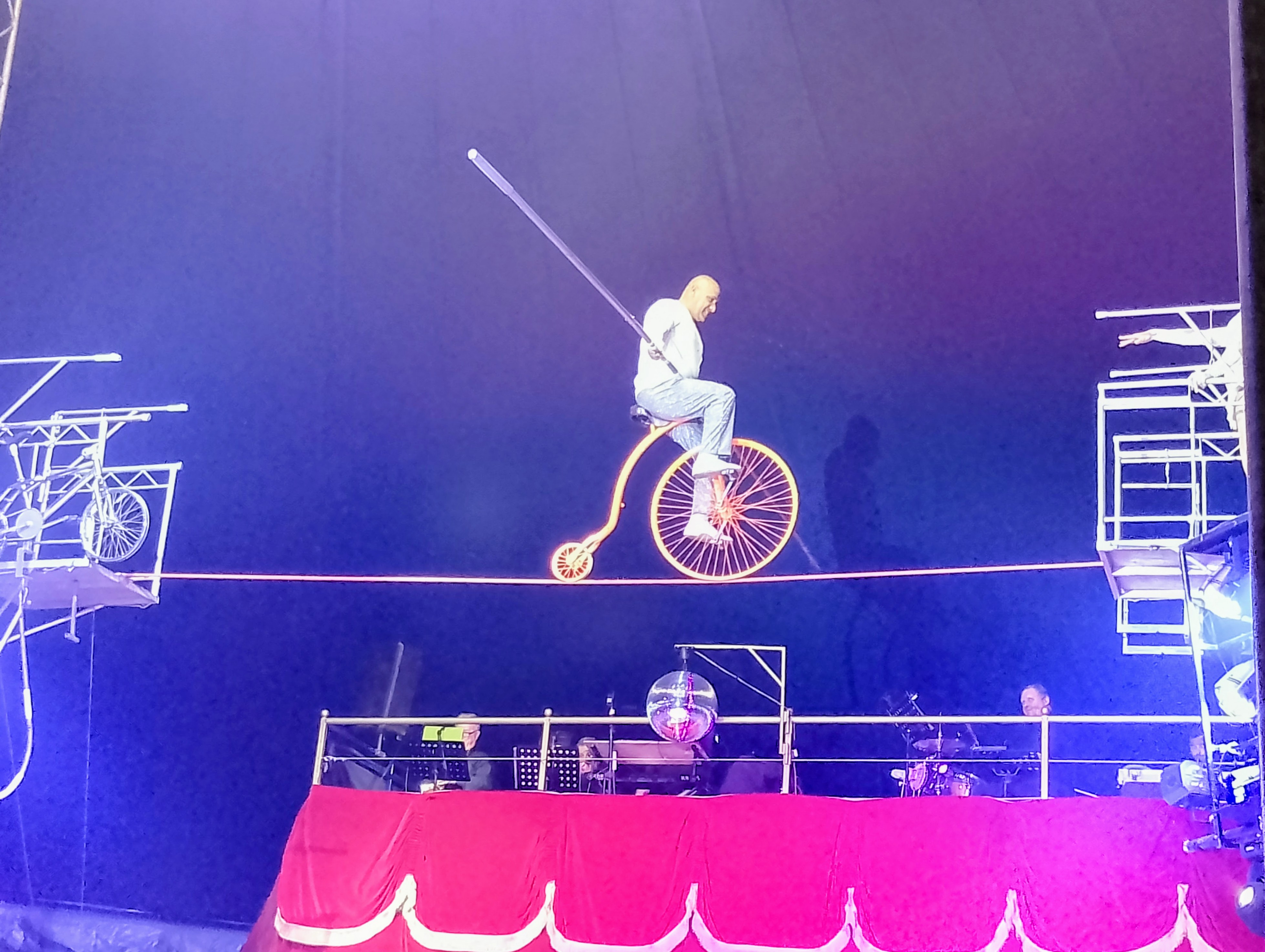 A couple of years ago, we went to see a travelling circus in the next-door village. My favourite act was a guy who rode a penny farthing … on a tightrope!