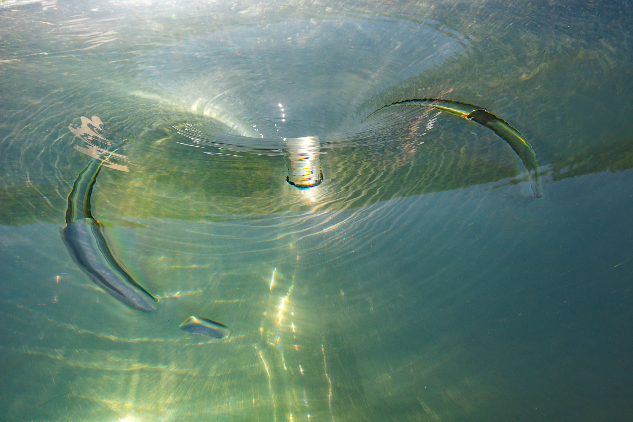 Sunlight is being refracted through water, reflections, and the ripples are distorting the picture. Streaks of light and shade; odd colours and shapes. As you lift your eyes to the top of the picture, it looks like a funnel and a tube. That is what is there, but our eyes are fooled by the water’s movement and reflections.