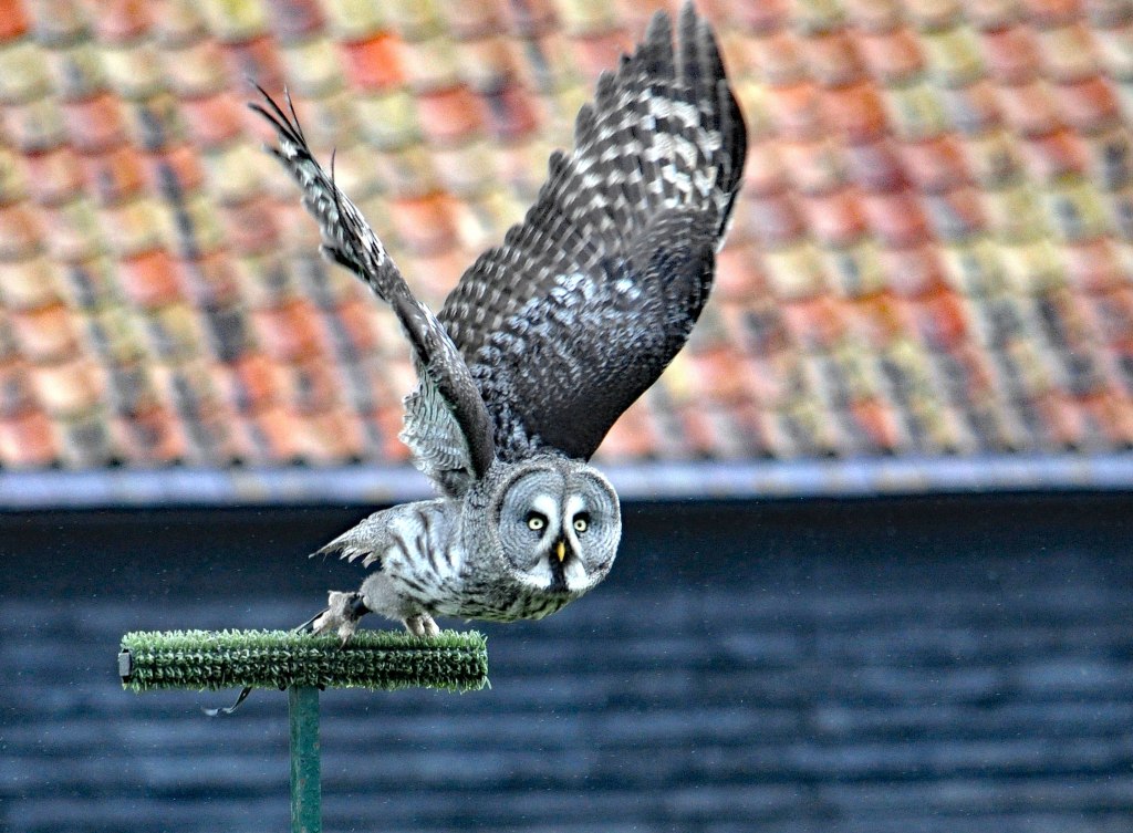 I rather like the reds and yellows of the roof tiles behind the bird: it adds a certain “something” to the story, and the greys of the barn wall make the owl’s face stand out beautifully.