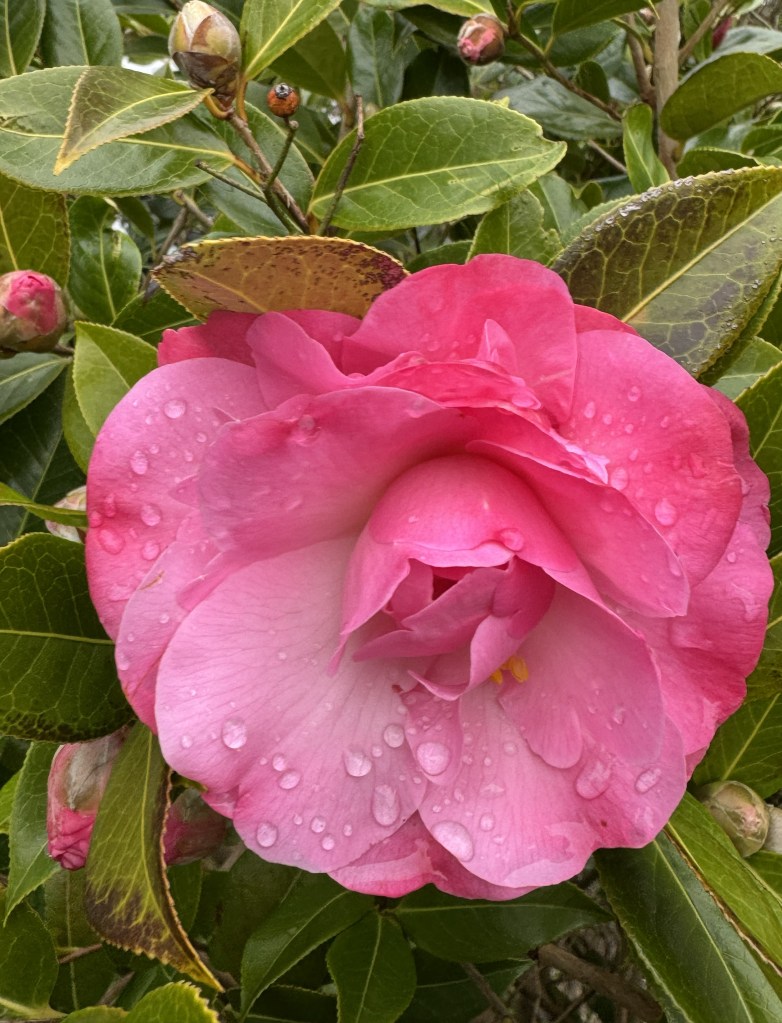 The first camellia this year burst forth from its bud today. It may be screaming for help after swallowing two weeks’ worth of rain in a single day- or just responding to the increasing light levels.