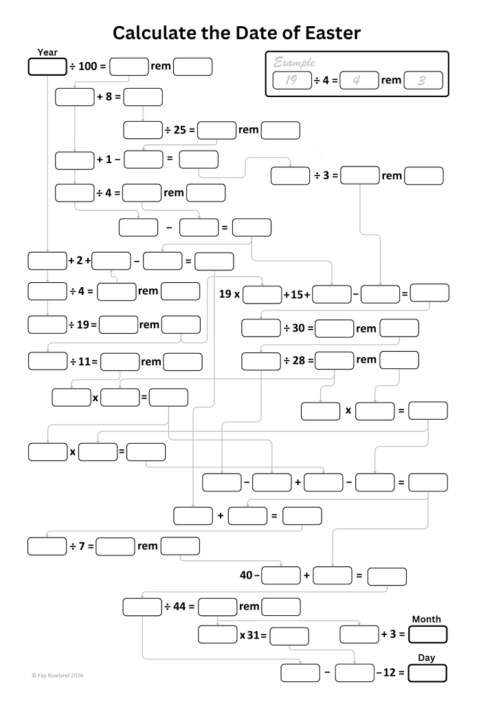 A quirky little resource for you today while I work on a long piece on the stations of the cross. Please make sure you are seated securely and have set down any hot beverages. I bring you the awesome majesty that is … the Calculate the Date of Easter Flowchart! Calculate the Date of Easter Flowchart (click words to download PDF, or right-click the image below for png)