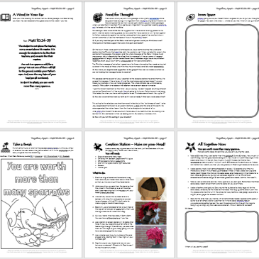 Matthew 10 – You Are Worth More Than Many Sparrows Welcome to Together Apart, a set of new intergenerational resources for all of us in God’s family. Ten jam-packed pages of great ideas that you can print off and use for free. Links for PDFs are below. Each week you’ll find Bible study ideas for … More Together Apart – Matt 10 – More Than Many Sparrows