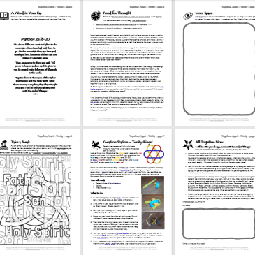 Matthew 28:16-20 Welcome to Together Apart, a set of new intergenerational resources for all of us in God’s family. Ten jam-packed pages of great ideas that you can print off and use for free. Links for PDFs are below. Each week you’ll find Bible study ideas for all ways of learnings and all ages (not … More Together, Apart – Trinity and The Great Commission